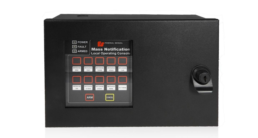 La nueva consola de operación local UltraVoice®️ de Federal Signal (UVLOC-B) es una interfaz de usuario remota fácil de usar para sistemas de alerta y notificación en interiores y exteriores. El UVLOC-B proporciona a un operador del sistema, habitante del edificio o personal de la instalación, un punto de activación e indicador de fallas del sistema. El UVLOC-B ofrece la capacidad de: activar hasta diez tonos o mensajes de voz digitales pregrabados y realizar anuncios de megafonía (PA) en vivo. La consola operativa local es ideal para proporcionar múltiples puntos de activación en un sistema de notificación masivo interior. El UVLOC-B está diseñado específicamente para funcionar con el controlador de interior UVIC-B.